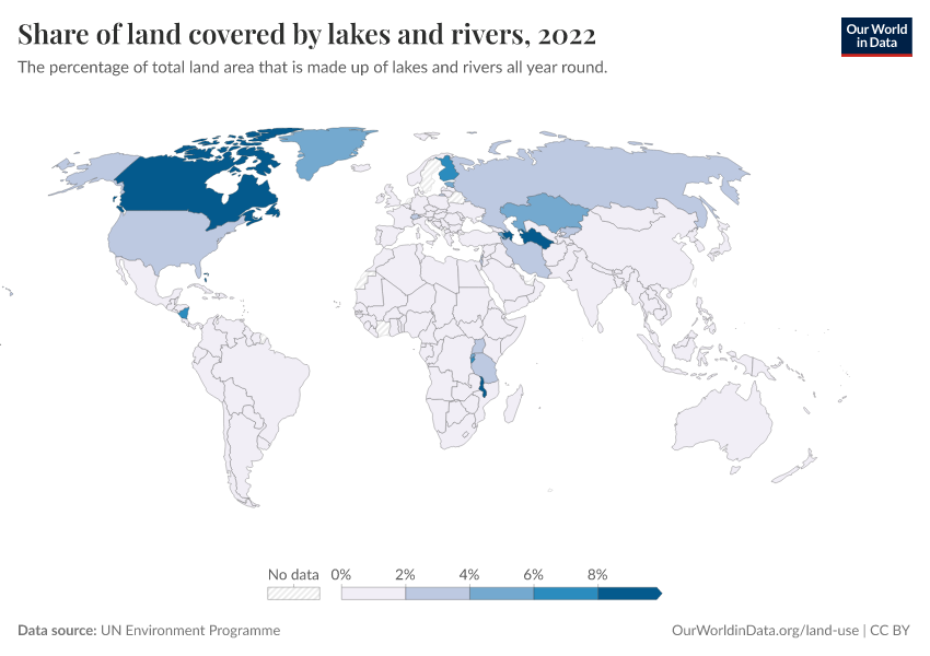 “Data Page: Share of land covered by lakes and rivers”. Our World in Data (2026). Data adapted from UN Environment Programme. Retrieved from https://multi-dim-redirects-index.owid.pages.dev/grapher/share-of-land-covered-by-lakes-and-rivers [online resource]How to cite this data
