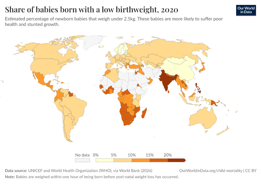 “Data Page: Share of babies born with a low birthweight”. Our World in Data (2026). Data adapted from UNICEF and World Health Organization (WHO), via World Bank. Retrieved from https://multi-dim-redirects-index.owid.pages.dev/grapher/share-of-low-birthweight-babies-born [online resource]How to cite this data