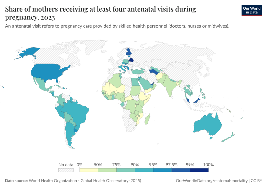 World Health Organization - Global Health Observatory (2025) – processed by Our World in Data. “Share of mothers receiving at least four antenatal visits during pregnancy” [dataset]. World Health Organization, “Global Health Observatory” [original data]. Retrieved January 8, 2026 from https://multi-dim-redirects-index.owid.pages.dev/grapher/share-of-mothers-receiving-at-least-four-antenatal-visits-during-pregnancy