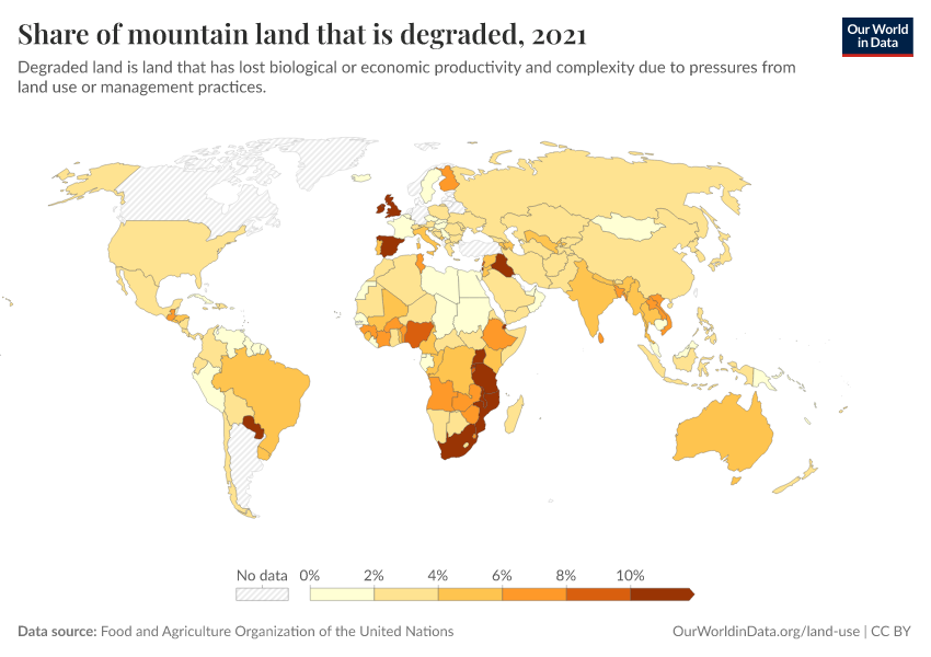 “Data Page: Share of mountain land that is degraded”. Our World in Data (2026). Data adapted from Food and Agriculture Organization of the United Nations. Retrieved from https://multi-dim-redirects-index.owid.pages.dev/grapher/share-of-mountain-land-that-is-degraded [online resource]How to cite this data