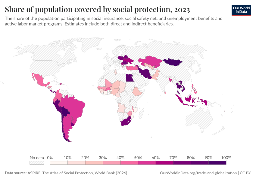 “Data Page: Share of population covered by social protection”. Our World in Data (2026). Data adapted from ASPIRE: The Atlas of Social Protection, World Bank. Retrieved from https://multi-dim-redirects-index.owid.pages.dev/grapher/share-of-population-covered-by-social-protection [online resource]How to cite this data