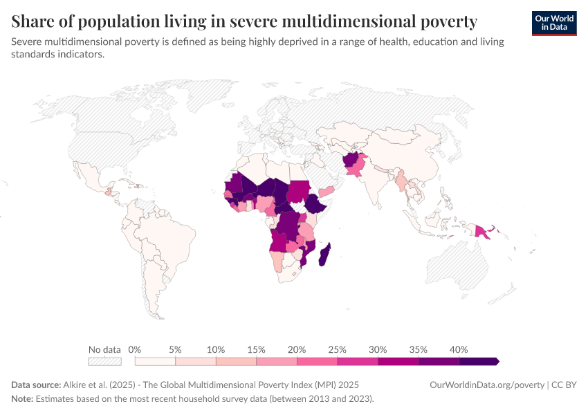 “Data Page: Share of population living in severe multidimensional poverty”, part of the following publication: Joe Hasell, Bertha Rohenkohl, Pablo Arriagada, Esteban Ortiz-Ospina, and Max Roser (2022) - “Poverty”. Data adapted from Alkire, Kanagaratnam and Suppa. Retrieved from https://multi-dim-redirects-index.owid.pages.dev/grapher/share-of-population-in-severe-multidimensional-poverty [online resource]How to cite this data