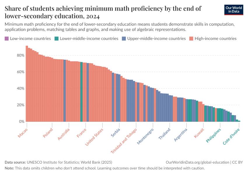 UNESCO Institute for Statistics – processed by Our World in Data. “Share of students achieving minimum math proficiency by the end of lower-secondary education” [dataset]. UNESCO Institute for Statistics, “Data from multiple sources” [original data]. Retrieved January 8, 2026 from https://multi-dim-redirects-index.owid.pages.dev/grapher/share-of-students-at-end-of-lower-secondary-education-achieving-minimum-math-proficiency