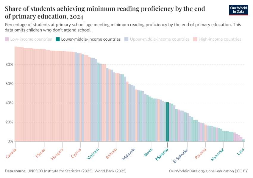 UNESCO Institute for Statistics (2025) – with minor processing by Our World in Data. “Share of students achieving minimum reading proficiency by the end of primary education” [dataset]. UNESCO Institute for Statistics, “UNESCO Institute for Statistics (UIS) - Education” [original data]. Retrieved January 8, 2026 from https://multi-dim-redirects-index.owid.pages.dev/grapher/share-of-students-at-end-of-primary-education-achieving-minimum-reading-proficiency