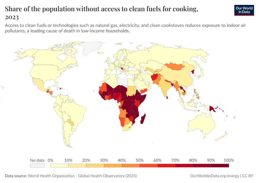 World Health Organization - Global Health Observatory (2025) – processed by Our World in Data. “Share of the population without access to clean fuels for cooking” [dataset]. World Health Organization, “Global Health Observatory” [original data]. Retrieved January 8, 2026 from https://multi-dim-redirects-index.owid.pages.dev/grapher/share-of-the-population-without-access-to-clean-fuels-for-cooking