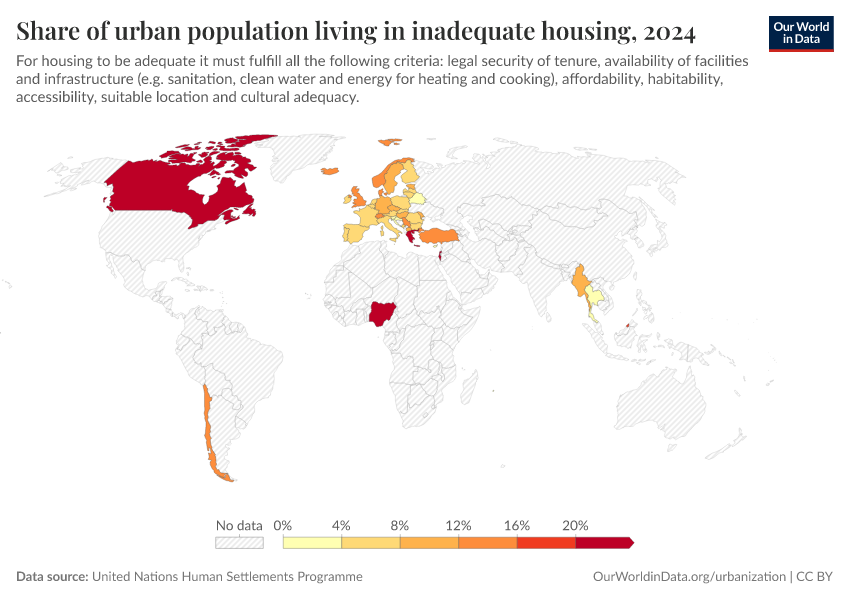 “Data Page: Share of urban population living in inadequate housing”. Our World in Data (2026). Data adapted from United Nations Human Settlements Programme. Retrieved from https://multi-dim-redirects-index.owid.pages.dev/grapher/share-of-urban-population-living-in-inadequate-housing [online resource]How to cite this data