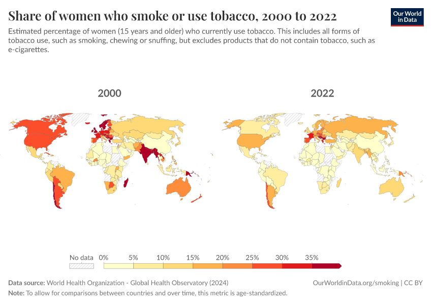 World Health Organization - Global Health Observatory (2024) – processed by Our World in Data. “Share of women who smoke or use tobacco” [dataset]. World Health Organization, “Global Health Observatory” [original data]. Retrieved January 8, 2026 from https://multi-dim-redirects-index.owid.pages.dev/grapher/share-of-women-who-are-smoking