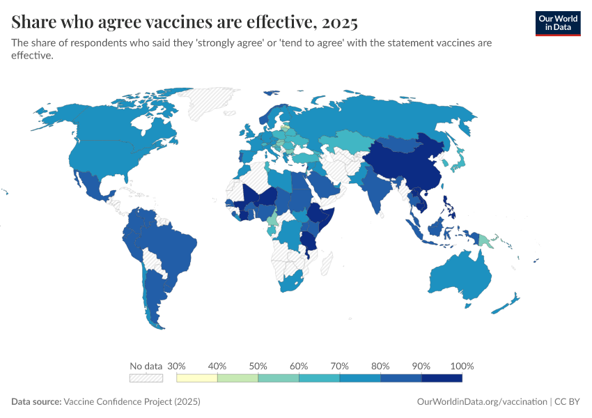 Vaccine Confidence Project (2025) – processed by Our World in Data. “Share who agree vaccines are effective” [dataset]. Vaccine Confidence Project, “Vaccine Confidence Index” [original data]. Retrieved January 8, 2026 from https://multi-dim-redirects-index.owid.pages.dev/grapher/share-who-agree-vaccines-are-effective