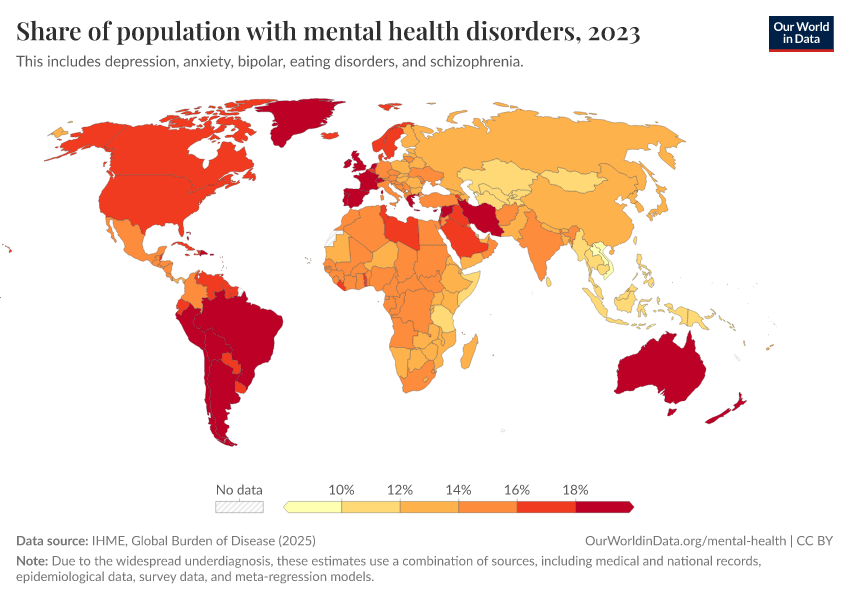 “Data Page: Share of population with mental health disorders”, part of the following publication: Esteban Ortiz-Ospina and Max Roser (2016) - “Global Health”. Data adapted from IHME, Global Burden of Disease. Retrieved from https://multi-dim-redirects-index.owid.pages.dev/grapher/share-with-mental-and-substance-disorders [online resource]How to cite this data