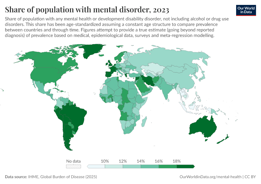 IHME, Global Burden of Disease (2024) – with major processing by Our World in Data. “Share of population with mental disorder” [dataset]. IHME, Global Burden of Disease, “Global Burden of Disease - Mental Health Prevalence” [original data]. Retrieved January 8, 2026 from https://multi-dim-redirects-index.owid.pages.dev/grapher/share-with-mental-health-or-development-disorder