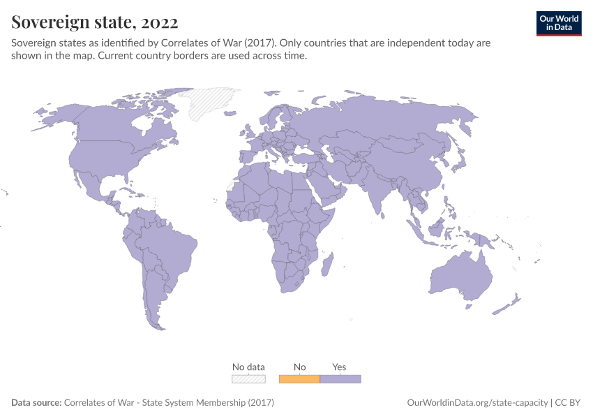 “Data Page: Sovereign state”, part of the following publication: Bastian Herre and Pablo Arriagada (2023) - “State Capacity”. Data adapted from Correlates of War. Retrieved from https://multi-dim-redirects-index.owid.pages.dev/grapher/sovereign-state-cow [online resource]How to cite this data