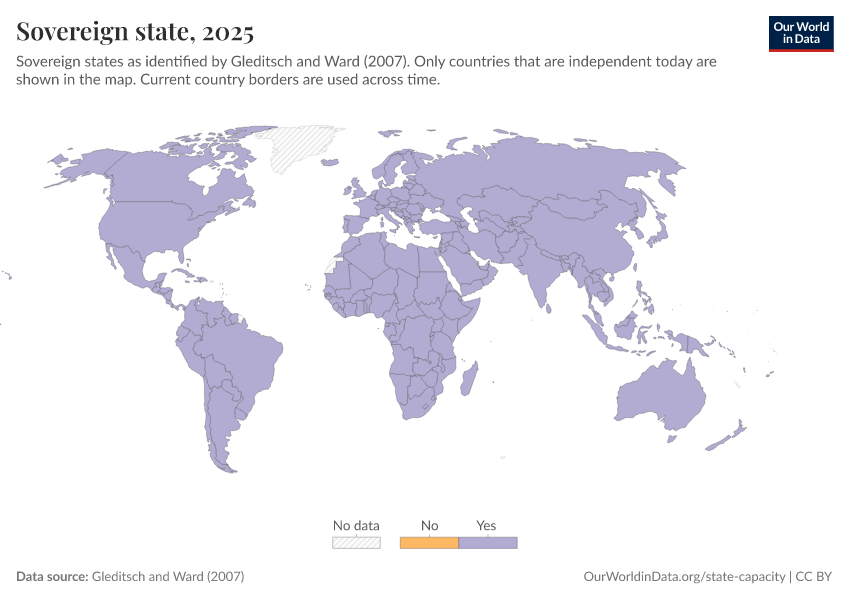 “Data Page: Sovereign state”, part of the following publication: Bastian Herre and Pablo Arriagada (2023) - “State Capacity”. Data adapted from Gleditsch and Ward. Retrieved from https://multi-dim-redirects-index.owid.pages.dev/grapher/sovereign-state-gleditsch-ward [online resource]How to cite this data