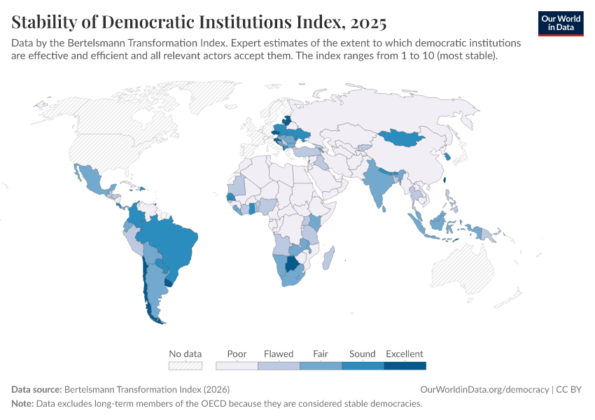 Bertelsmann Transformation Index (2024) – processed by Our World in Data. “Stability of Democratic Institutions Index” [dataset]. Bertelsmann Transformation Index, “Bertelsmann Transformation Index, Scores” [original data]. Retrieved January 8, 2026 from https://multi-dim-redirects-index.owid.pages.dev/grapher/stability-democratic-institutions-index-bti