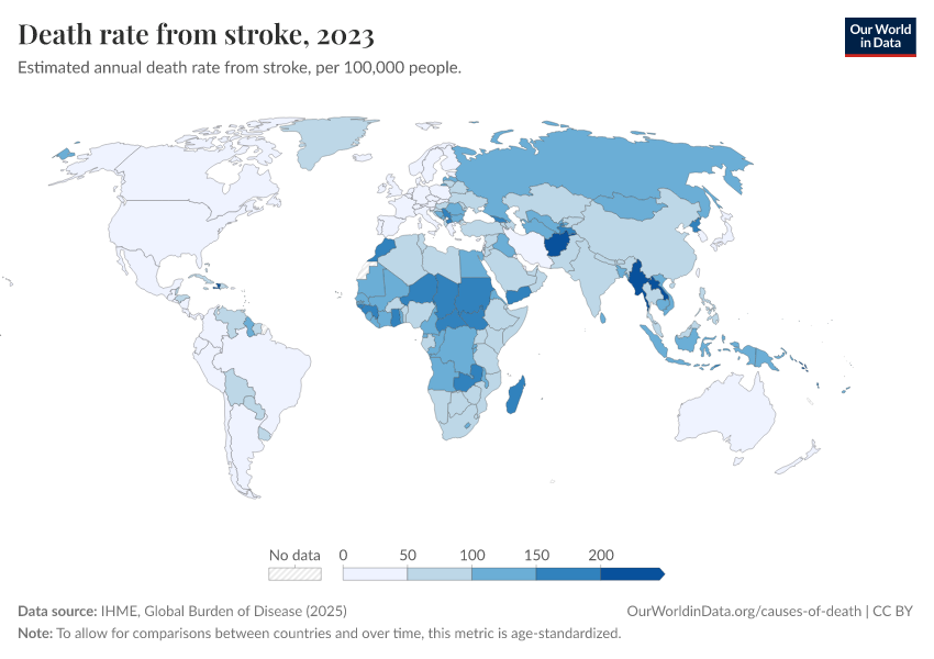IHME, Global Burden of Disease (2024) – with minor processing by Our World in Data. “Death rate from stroke” [dataset]. IHME, Global Burden of Disease, “Global Burden of Disease - Deaths and DALYs” [original data]. Retrieved January 8, 2026 from https://multi-dim-redirects-index.owid.pages.dev/grapher/stroke-death-rates