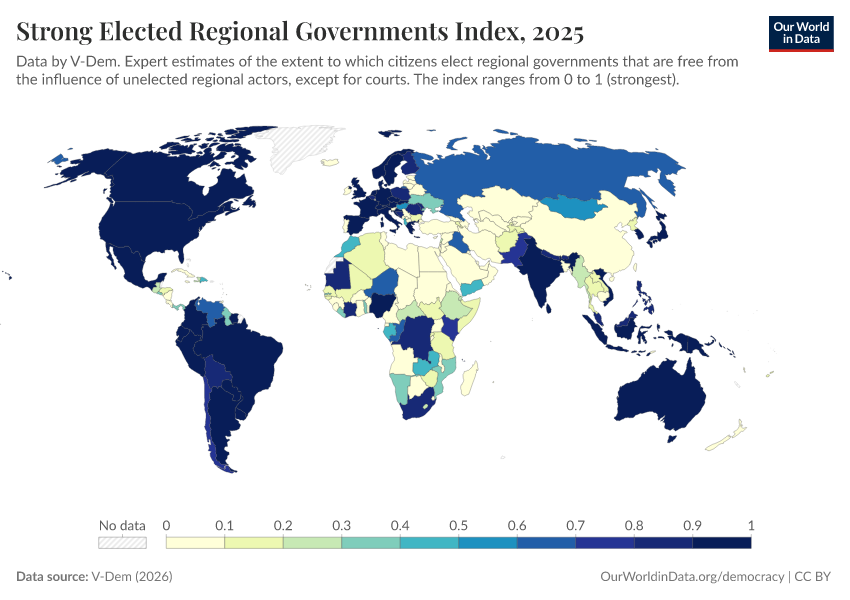 V-Dem (2025) – processed by Our World in Data. “Elected regional governments – V-Dem” [dataset]. V-Dem, “Democracy report v15” [original data]. Retrieved January 8, 2026 from https://multi-dim-redirects-index.owid.pages.dev/grapher/strong-elected-regional-governments-index
