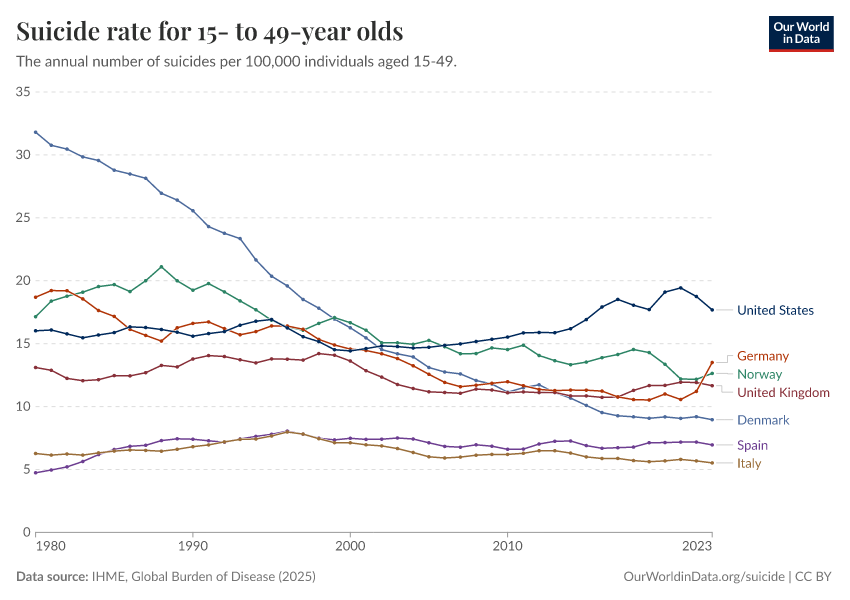 “Data Page: Suicide rate for 15- to 49-year olds”, part of the following publication: Esteban Ortiz-Ospina and Max Roser (2016) - “Global Health”. Data adapted from IHME, Global Burden of Disease. Retrieved from https://multi-dim-redirects-index.owid.pages.dev/grapher/suicide-rate-for-15--to-49-year-olds [online resource]How to cite this data