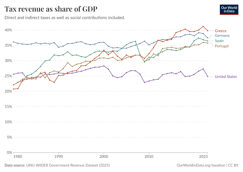 UNU-WIDER Government Revenue Dataset (2023) – with major processing by Our World in Data. “Tax revenues as a share of GDP – UNU-WIDER” [dataset]. UNU-WIDER, “Government Revenue Dataset (GRD) 2023” [original data]. Retrieved January 8, 2026 from https://multi-dim-redirects-index.owid.pages.dev/grapher/tax-revenues-as-a-share-of-gdp-unu-wider