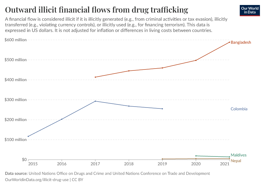 United Nations Office on Drugs and Crime and United Nations Conference on Trade and Development – processed by Our World in Data. “Outward illicit financial flows from drug trafficking” [dataset]. United Nations Office on Drugs and Crime and United Nations Conference on Trade and Development, “Data from multiple sources” [original data]. Retrieved January 8, 2026 from https://multi-dim-redirects-index.owid.pages.dev/grapher/total-outward-financial-flows-from-drug-trafficking