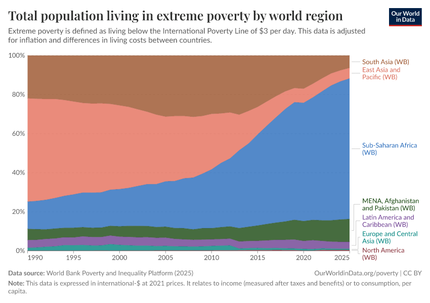 World Bank Poverty and Inequality Platform (2025) – with major processing by Our World in Data. “Total population living in extreme poverty by world region – World Bank” [dataset]. World Bank Poverty and Inequality Platform, “World Bank Poverty and Inequality Platform (PIP) 20250930_2021, 20250930_2017” [original data]. Retrieved January 8, 2026 from https://multi-dim-redirects-index.owid.pages.dev/grapher/total-population-living-in-extreme-poverty-by-world-region