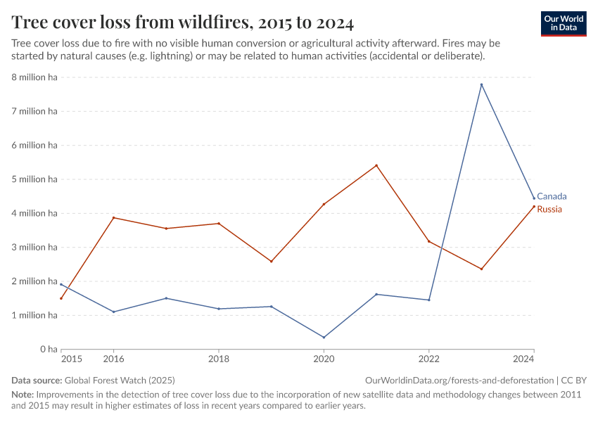 Global Forest Watch (2025) – with major processing by Our World in Data. “Tree cover loss from wildfires” [dataset]. Global Forest Watch, “Tree Cover Loss by Dominant Driver” [original data]. Retrieved January 8, 2026 from https://multi-dim-redirects-index.owid.pages.dev/grapher/tree-cover-loss-from-wildfires
