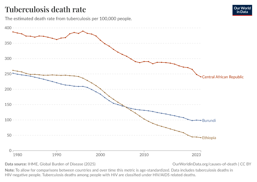 IHME, Global Burden of Disease (2024) – with minor processing by Our World in Data. “Tuberculosis death rate” [dataset]. IHME, Global Burden of Disease, “Global Burden of Disease - Deaths and DALYs” [original data]. Retrieved January 8, 2026 from https://multi-dim-redirects-index.owid.pages.dev/grapher/tuberculosis-death-rates