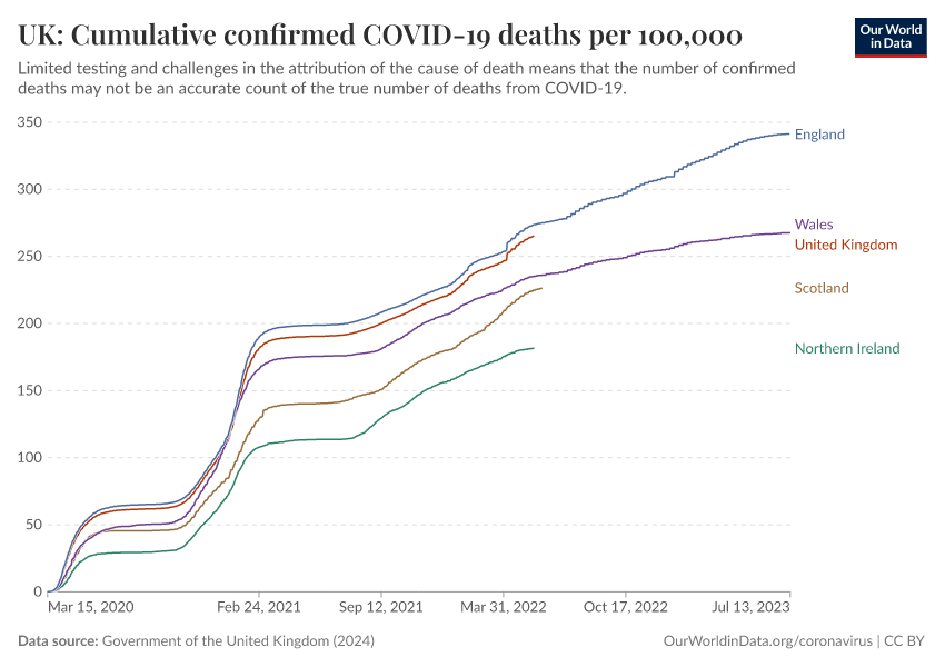 Government of the United Kingdom (2024) – with minor processing by Our World in Data. “UK: Cumulative confirmed COVID-19 deaths per 100,000” [dataset]. Government of the United Kingdom, “UKHSA data dashboard” [original data]. Retrieved January 8, 2026 from https://multi-dim-redirects-index.owid.pages.dev/grapher/uk-cumulative-covid-deaths-rate