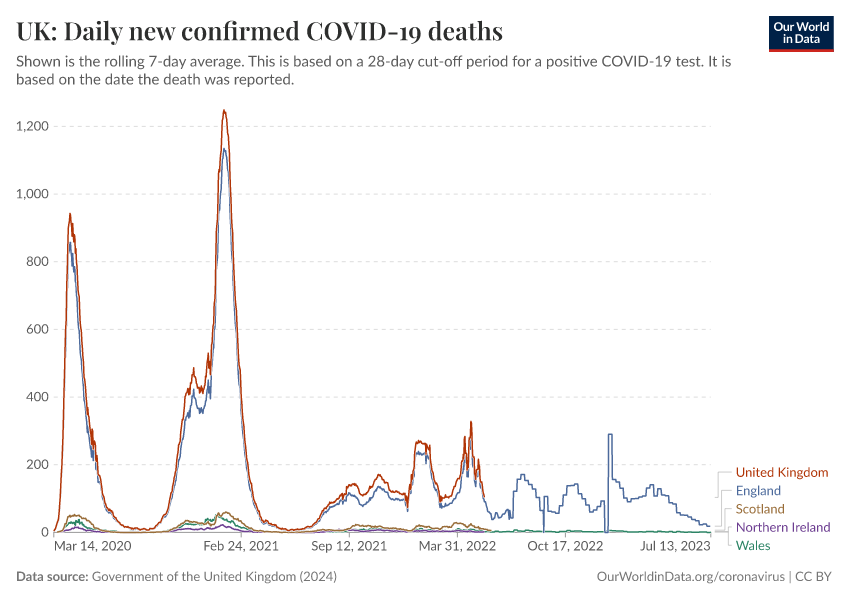 Government of the United Kingdom (2024) – with minor processing by Our World in Data. “UK: Daily new confirmed COVID-19 deaths” [dataset]. Government of the United Kingdom, “UKHSA data dashboard” [original data]. Retrieved January 8, 2026 from https://multi-dim-redirects-index.owid.pages.dev/grapher/uk-daily-covid-deaths