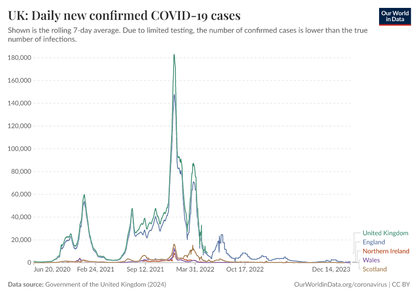 Government of the United Kingdom (2024) – with minor processing by Our World in Data. “UK: Daily new confirmed COVID-19 cases” [dataset]. Government of the United Kingdom, “UKHSA data dashboard” [original data]. Retrieved January 8, 2026 from https://multi-dim-redirects-index.owid.pages.dev/grapher/uk-daily-new-covid-cases