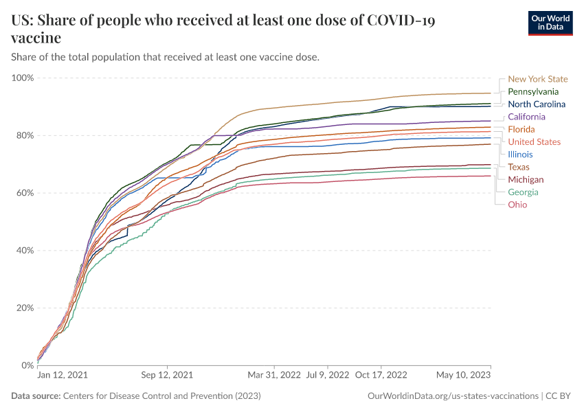 Centers for Disease Control and Prevention (2023) – processed by Our World in Data. “US: Share of people who received at least one dose of COVID-19 vaccine” [dataset]. Centers for Disease Control and Prevention, “COVID-19, Vaccinations (United States)” [original data]. Retrieved January 8, 2026 from https://multi-dim-redirects-index.owid.pages.dev/grapher/us-covid-19-share-people-vaccinated