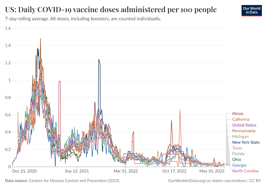 Centers for Disease Control and Prevention (2023) – processed by Our World in Data. “US: Daily COVID-19 vaccine doses administered per 100 people” [dataset]. Centers for Disease Control and Prevention, “COVID-19, Vaccinations (United States)” [original data]. Retrieved January 8, 2026 from https://multi-dim-redirects-index.owid.pages.dev/grapher/us-daily-covid-vaccine-doses-per-100