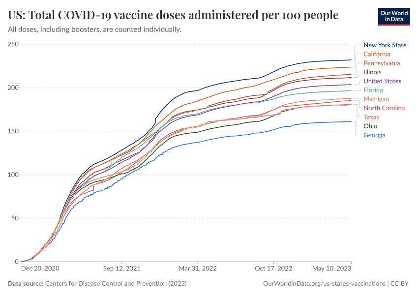 Centers for Disease Control and Prevention (2023) – processed by Our World in Data. “US: Total COVID-19 vaccine doses administered per 100 people” [dataset]. Centers for Disease Control and Prevention, “COVID-19, Vaccinations (United States)” [original data]. Retrieved January 8, 2026 from https://multi-dim-redirects-index.owid.pages.dev/grapher/us-state-covid-vaccines-per-100