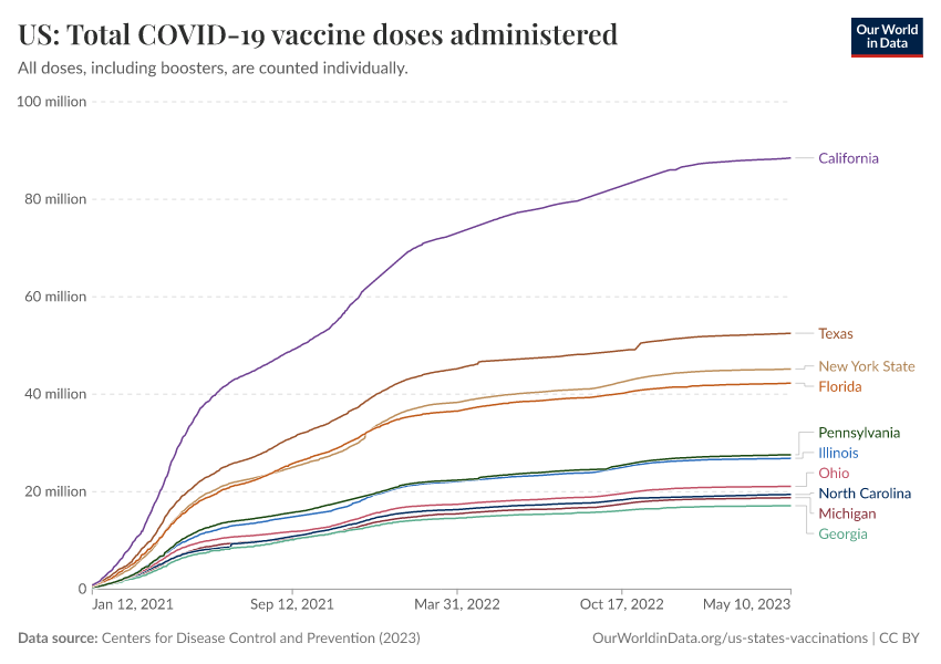 Centers for Disease Control and Prevention (2023) – processed by Our World in Data. “US: Total COVID-19 vaccine doses administered” [dataset]. Centers for Disease Control and Prevention, “COVID-19, Vaccinations (United States)” [original data]. Retrieved January 8, 2026 from https://multi-dim-redirects-index.owid.pages.dev/grapher/us-total-covid-19-vaccine-doses-administered