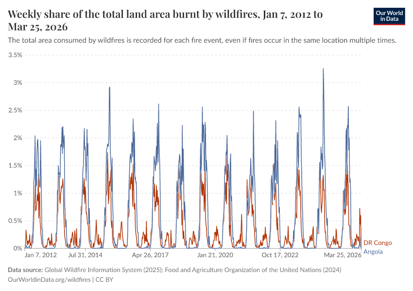 Global Wildfire Information System (2026); Global Wildfire Information System (2024); Food and Agriculture Organization of the United Nations (2024) – with minor processing by Our World in Data. “Weekly share of the total land area burnt by wildfires” [dataset]. Global Wildfire Information System, “Seasonal wildfire trends”; Food and Agriculture Organization of the United Nations, “Land, Inputs and Sustainability: Land Use” [original data]. Retrieved January 8, 2026 from https://multi-dim-redirects-index.owid.pages.dev/grapher/weekly-share-of-the-total-land-area-burnt-by-wildfires