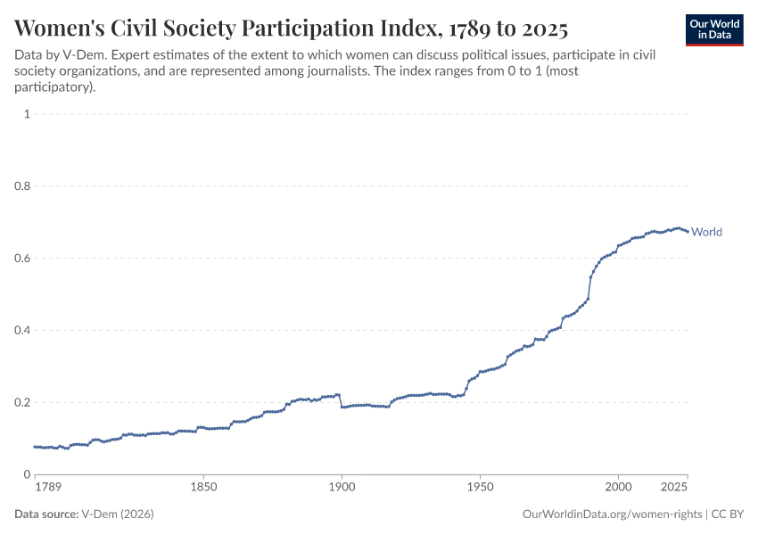 “Data Page: Women's civil society participation index”, part of the following publication: Bastian Herre, Lucas Rodés-Guirao, and Esteban Ortiz-Ospina (2013) - “Democracy”. Data adapted from V-Dem. Retrieved from https://multi-dim-redirects-index.owid.pages.dev/grapher/women-civil-society-participation-index [online resource]How to cite this data