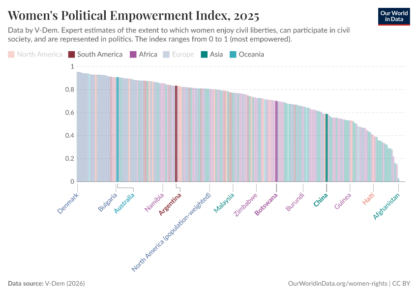 V-Dem (2025) – processed by Our World in Data. “Women's political empowerment index – V-Dem” [dataset]. V-Dem, “Democracy report v15” [original data]. Retrieved January 8, 2026 from https://multi-dim-redirects-index.owid.pages.dev/grapher/women-political-empowerment-index