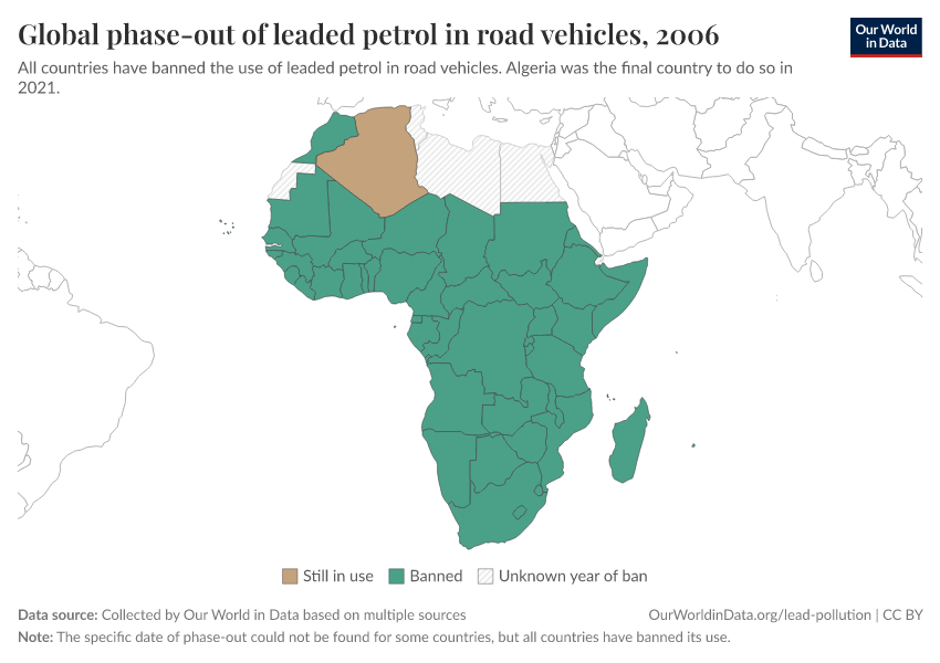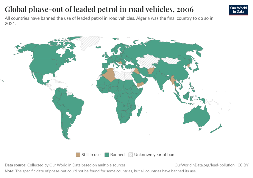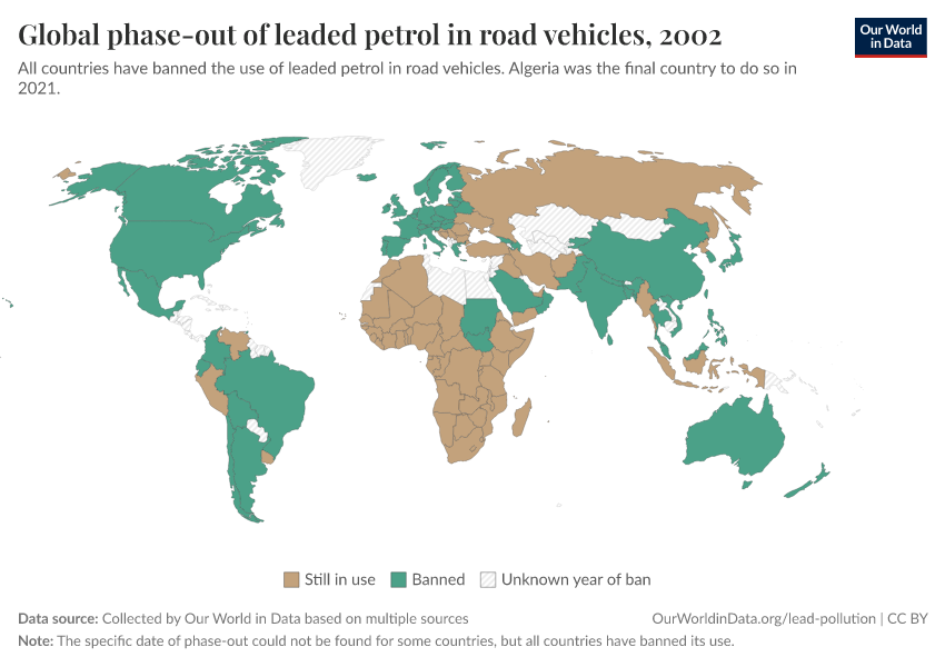 Hannah Ritchie (2022) - “How the world eliminated lead from gasoline” Published online at OurWorldinData.org. Retrieved from: 'https://multi-dim-redirects-index.owid.pages.dev/leaded-gasoline-phase-out' [Online Resource]BibTeX citation