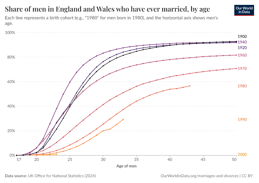 Some countries have statistical records going back several generations, which allow us to estimate marriage rates by age and year of birth. The charts here show this data for women and men born in England and Wales as early as 1900.