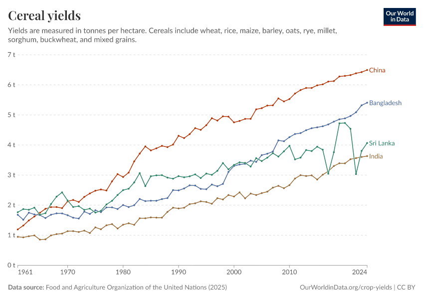 I’ve written previously about the benefits of agricultural technologies such as fertilizers, better seeds, pesticides, and irrigation for food production, poverty alleviation, and sparing natural habitat. These technologies have played a massive role in the dramatic rise in crop yields seen in countries like Sri Lanka, India, China, and Bangladesh. See the chart below.