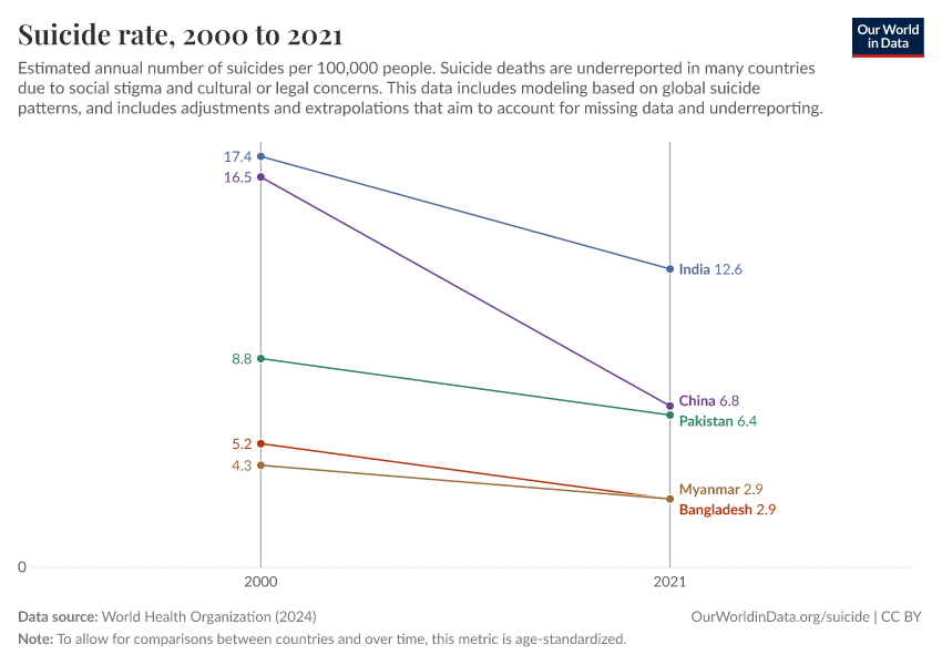At the turn of the millennium, Sri Lanka had the second-highest suicide rate in the world (after Greenland). But look at the chart below: rates have fallen by almost two-thirds since then. Despite it having a growing population, the number of Sri Lankans dying from suicide has more than halved, saving thousands of lives every year.2