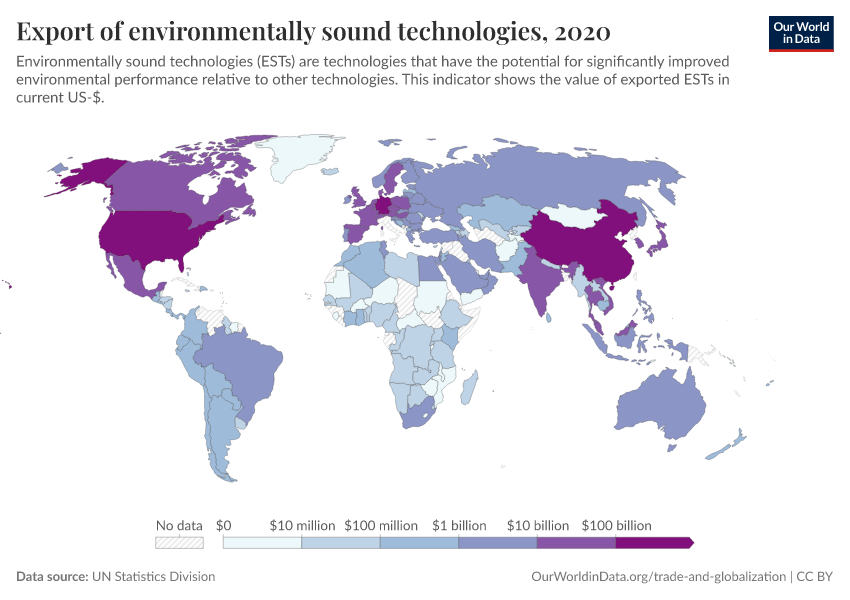 This indicator is measured in terms of the total trade of tracked ESTs, which includes exports, imports, and re-exports and re-imports, as well as national investment in ESTs. Data on exports and imports of ESTs is shown in the interactive visualization.