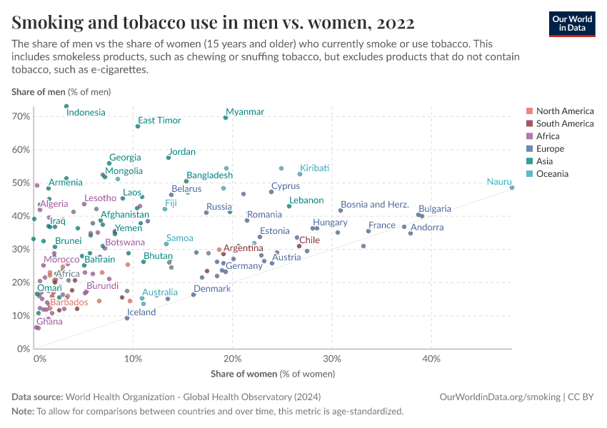 We see that almost all countries lie above the grey line, meaning a higher share of men smoke. There are only a few exceptions.