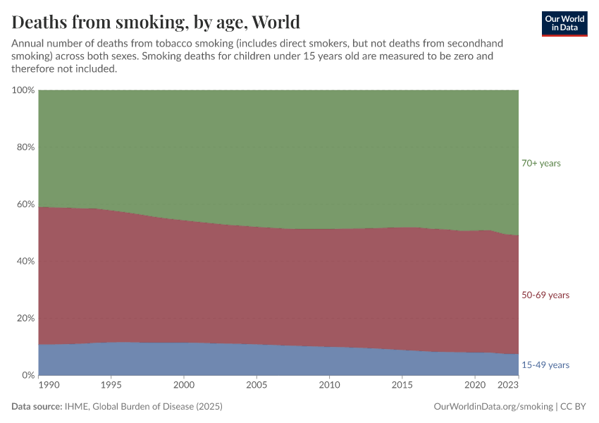 When we look at the breakdown of deaths from smoking by age, we see that it is mainly older populations that are affected.