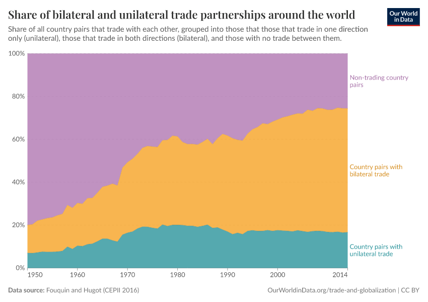 In the chart, all possible country pairs are partitioned into three categories: the top portion represents the fraction of country pairs that do not trade with one another; the middle portion represents those that trade in both directions (they export to one another); and the bottom portion represents those that trade in one direction only (one country imports from, but does not export to, the other country).