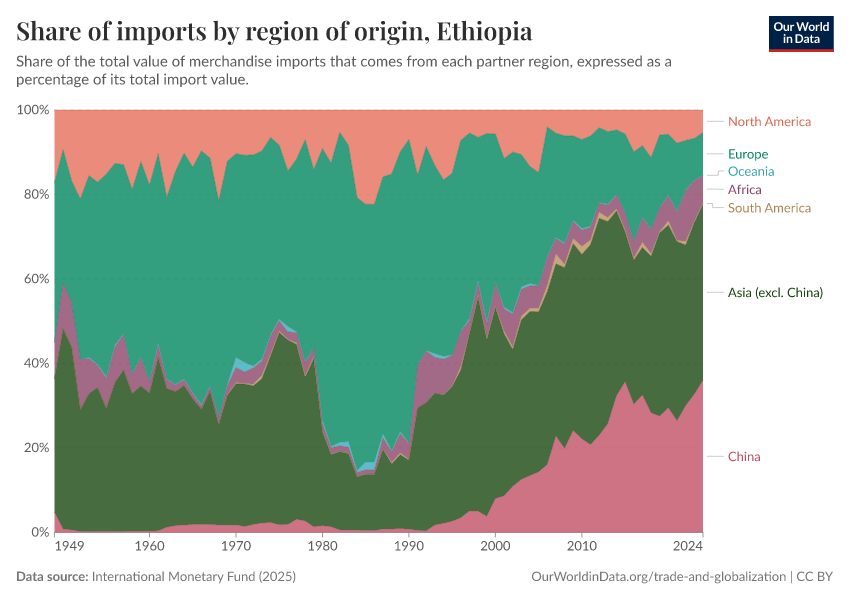 Ethiopia, home to around 130 million people, is one of Africa’s largest countries and has experienced rapid economic growth in recent decades. In the early 1990s, over 40% of Ethiopia’s imports came from Europe, while very little came from China. Since then, the roles of China and Europe have almost reversed. Imports from China now account for one-third of Ethiopia’s total imported goods.10