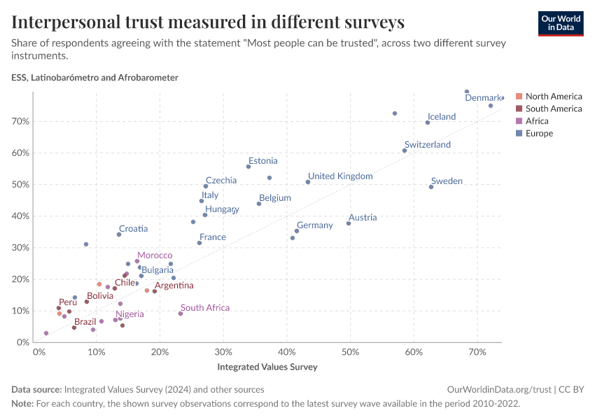 The chart shows that there is consistency — in countries where one survey reports high levels of self-reported trust, the other survey reflects the same. For example, in Peru, both the World Values Survey and the Latinobarometer report very low levels of self-reported trust.