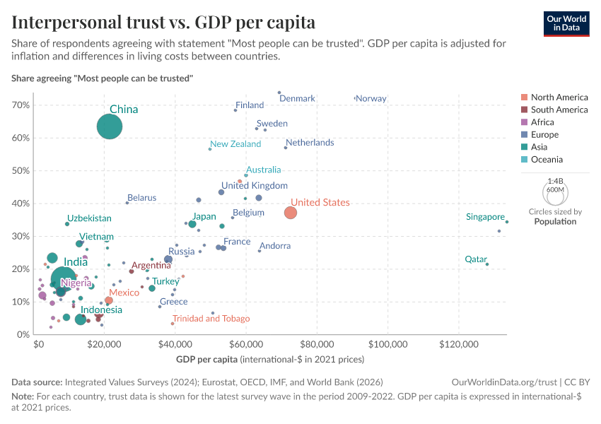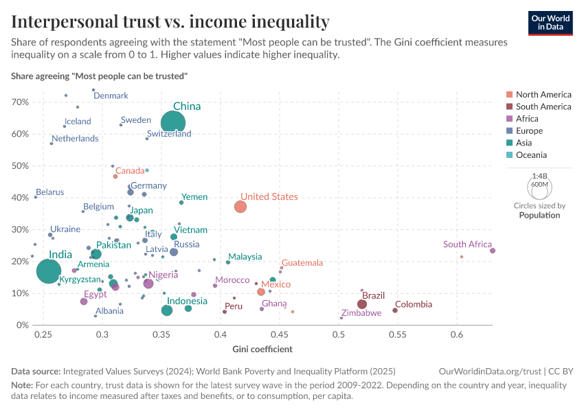 Each dot on this scatter-plot corresponds to a different country, with colors representing different world regions and dot sizes representing the size of the population. A Gini index of 0 would represent perfect equality, so the observed negative correlation in this graph shows that higher inequality is associated with lower trust.