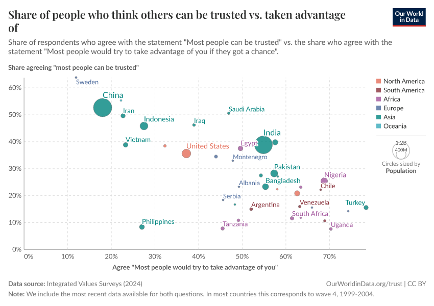 Our next chart illustrates this by comparing the percentage of respondents who agree with the statement "most people can be trusted" against those who agree that "most people would try to take advantage of you if they had a chance."