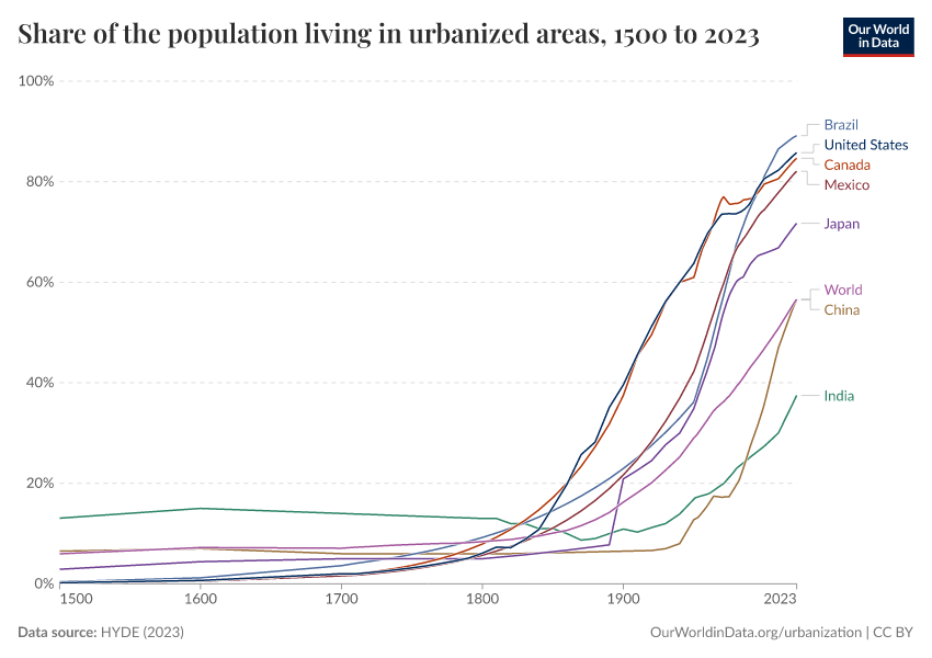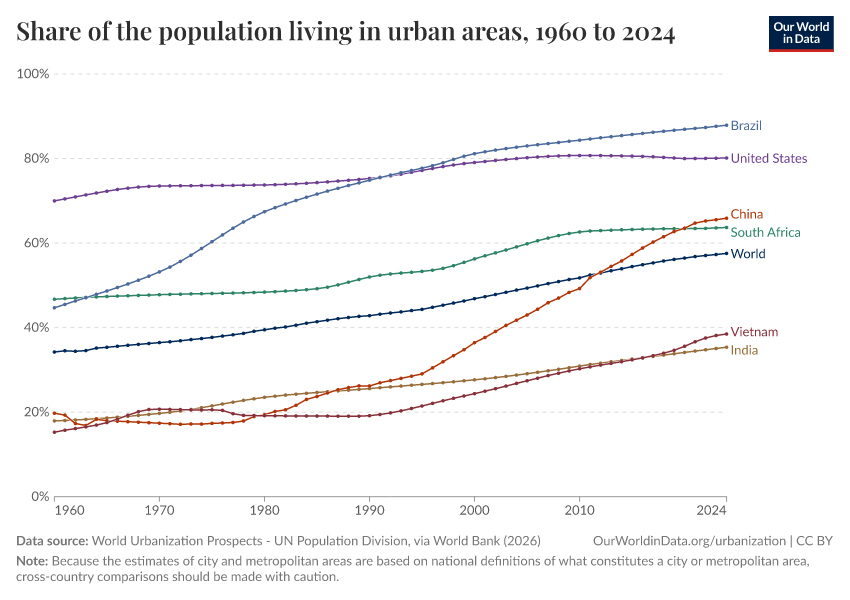 Hannah Ritchie, Veronika Samborska, and Max Roser (2024) - “Urbanization” Published online at OurWorldinData.org. Retrieved from: 'https://multi-dim-redirects-index.owid.pages.dev/urbanization' [Online Resource]BibTeX citation