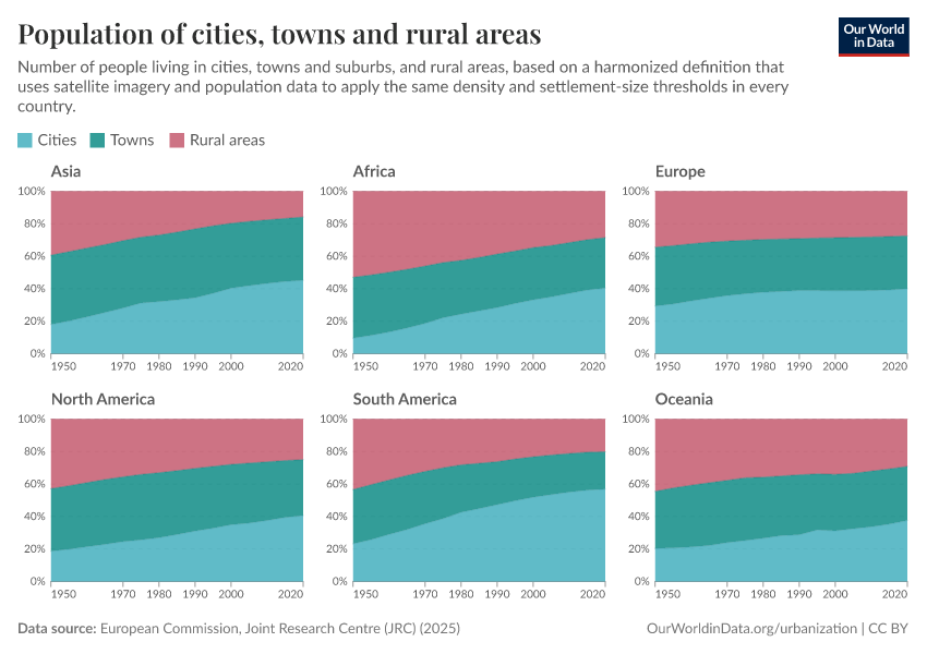 However, the manual on how to apply the Degree of Urbanization recommends reporting figures across three distinct categories—cities, towns, and villages—rather than using a simple urban-rural dichotomy. This approach recognizes urbanization as a continuum, acknowledging that towns occupy a unique position, differing significantly from both cities and villages in their characteristics and needs. The reported cities, and towns population shares by continent are shown in the chart below.