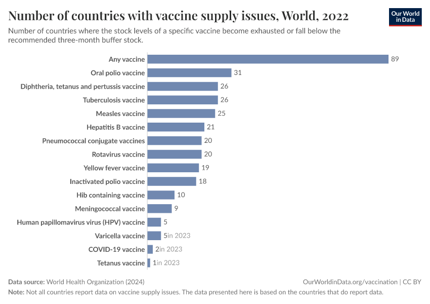 The chart shows that around 90 countries reported shortages of at least one vaccine in 2022. The most common were oral polio, DTP, and BCG vaccines — critical for preventing polio and tuberculosis. Even vaccines for diseases like rotavirus (the most common cause of death from diarrheal disease) and pneumococcal disease faced shortages, though to a lesser extent.